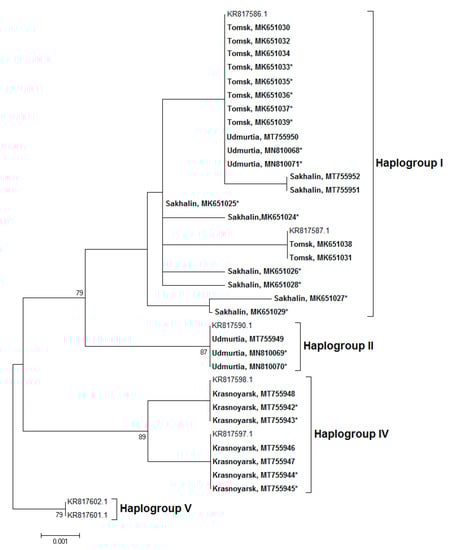 As Wolbachia infection was uniform across a vast territory, we analyzed a 620 bp barcode region of the COI gene to characterize maternal inheritance in more detail. In particular, we aimed to determine the mtDNA haplotype of infected and uninfected P. proximus specimens at all sampling sites. As references, we used data from Kononov et al. [42], where five mtDNA haplogroups have been described. The analyzed mtDNA of infected and uninfected samples of the Sakhalin and Tomsk collections belonged to haplogroup I (Figure 4). In Udmurtia they belonged to haplogroups I and II, and in Krasnoyarsk haplogroup IV was detected. Thus, we did not find dependence between the Wolbachia infection status and mtDNA haplogroup.