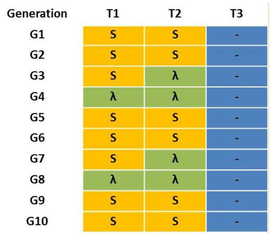 Treatment scenarios T1–T3 for the multi-resistant MR laboratory strain of Ceratitis capitata. “S” in yellow means a treatment with 100 ppm of spinosad, “λ” in green means a treatment with 125 ppm of lambda-cyhalothrin and “-” in blue means absence of insecticide treatment.