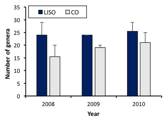 Annual richness of spider genera (mean ± SE) in pear orchards. LISO, low-intensity spraying orchards; CO, conventional orchards.