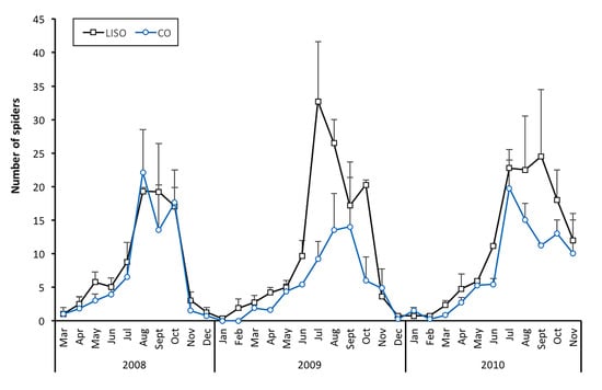 Monthly abundance (mean ± SE) of the number of spiders in the beating of 90 branches, collected throughout the period of study in orchards with two different intensity of spraying (LISO: low-intensity spraying orchards; CO: conventional orchards).
