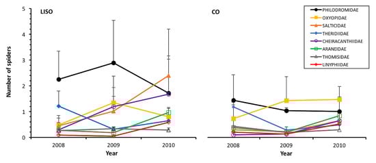 Annual abundance (mean ± SE, beating of 90 branches) of the different families of spiders in pear orchards over three years. LISO, low-intensity spraying orchards; CO, conventional orchards.