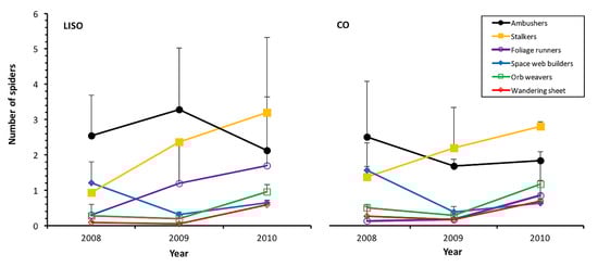 Annual abundance (mean ± SE, beating of 90 branches) of the different guilds of spiders in pear orchards over three years. LISO, low-intensity spraying orchards; CO, conventional orchards.