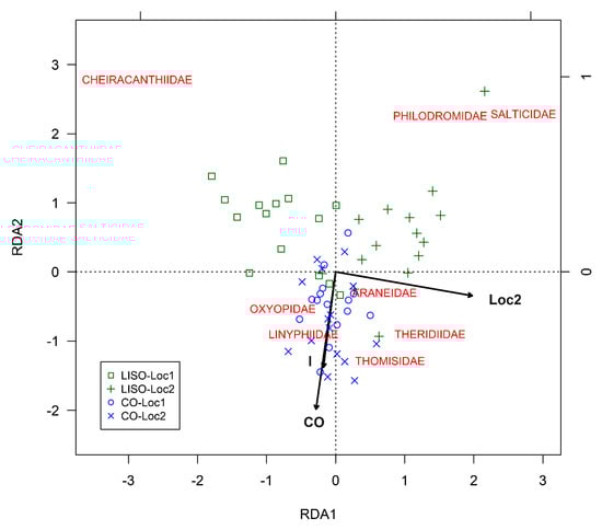 Redundancy analyses (RDA) for the monthly abundance of spider families found in pear orchards as a function of intensity of spraying, locality, and their interaction. RDA1, first constrained ordination axis; RDA2, second constrained axis; LISO, low-intensity spraying orchards; CO, conventional orchards; Loc2, locality 2; I, interaction.