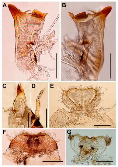 Vietnamella nanensis sp. n. (A) left mandible; (B) right mandible; (C) maxilla; (D) maxillary palp; (E) labium; (F) labrum; (G) hypopharynx. Scale bars: 0.2 mm.