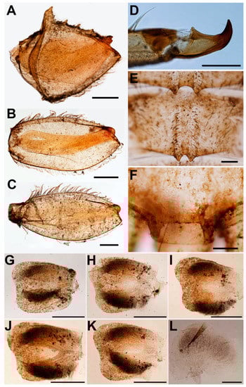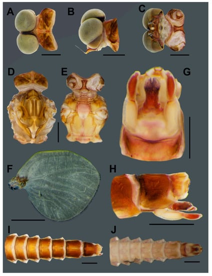 - Abdomen. Genitalia with penis and forceps relatively short and broad; penis with apicomedian emargination, length almost equal to second forceps segment; forceps with total length = 0.96 mm, basal:median segment ratio = 1.4:1 (Figure 4G–H). Terga reddish brown; segments VIII–IX with pair of pale median lines (Figure 4I); sterna light brown; segment IX, penis and forceps with dark brown markings (Figure 4J).