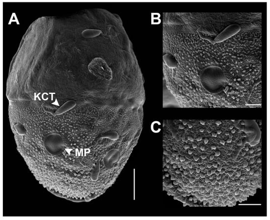 - Eggs (dissected from imago, Figure 6). Ovoid, with length approximately 310 µm, width approximately 220 µm; nearly half of egg covered with helmet-shaped polar cap (Figure 6A). Rod-shaped knob terminated coiled thread (KCT) around egg body; 2 or 3 tagenoform-type micropyles at center, without protuberances in micropyle area (Figure 6B). Chorionic surface with protuberances, prominent in posterior area (Figure 6C).