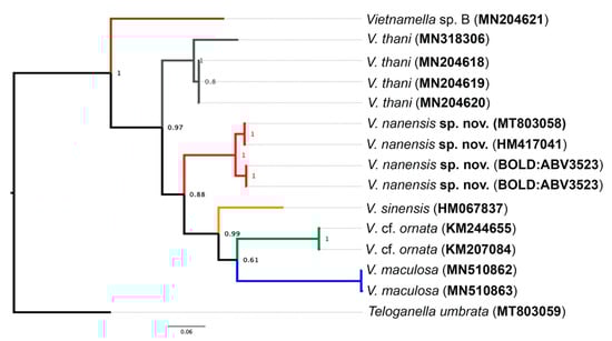 Bayesian interference of Vietnamellidae. The COI phylogenetic reconstruction of six different species of Vietnamella with the branch probability support. The accession number of GenBank or Barcode Index Number (BIN) of Barcode of Life Data System (BOLD) in brackets. Teloganella umbrata was used as the outgroup.