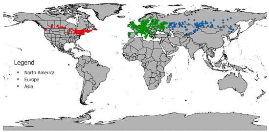 A total of 1392 georeferenced occurrence records were assembled from collaborative L. lilii researchers in Canada [33], gleaned from primary literature [34,35,36], or obtained from our own research [22,37,38]. These records represented 632 sites in Europe, 150 sites in Asia, and 610 sites in North America (Figure 1). According to the Catalogue of Paleartic Coleoptera [39], L. lilii is recorded from 40 European countries, European Russia, nine Asian countries, and Asian Russia (no occurrence records provided in the publication). We were unable to find georeferenced occurrence records for 11 of the 50 countries in the beetle’s recorded range (5 in Europe, and 6 in Asia).