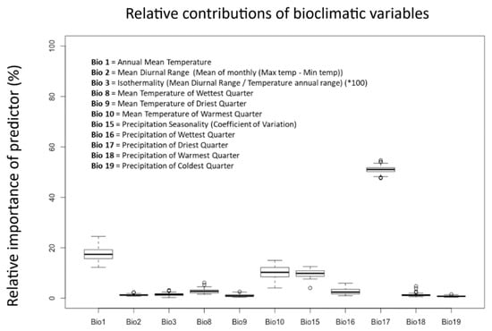 Relative contributions of bioclimatic variables. Boxplots showing the relative contributions of 11 bioclimatic variables to the Maxent model. The plots show variation in the importance of each predictor within the 50 replicate runs for the model. Below is a legend describing what the eleven bioclimatic variables represent in relation to temperature and precipitation.