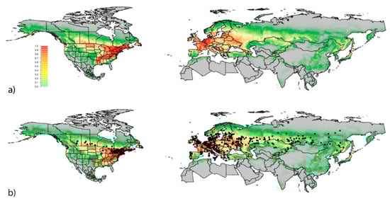 Habitat suitability model of native and invaded range. Predicted probability of occurrence of Lilioceris lilii, ranging from lowest (0, grey) to highest (1, red) probability, based on 466 data points given by the “cloglog” output in the Maxent software. The model’s average AUC ± SD was 0.898 ± 0.01. Panels show: (a) habitat suitability model of North America, Europe, and Asia (b) habitat suitability model overlaid with L. lilii site data.