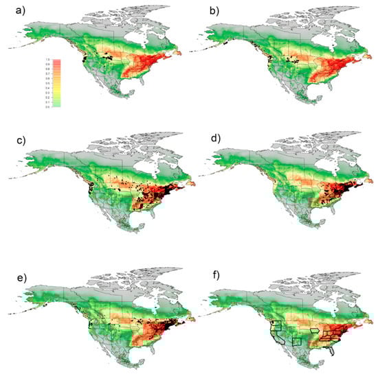 Habitat suitability model overlaid with native Liliaceae records. Habitat suitability model of North America overlaid with site data for native species of Calochortus, Fritillaria, Lilium, and Streptopus that had habitat suitability scores of ≥0.50. Predicted probability of occurrence of Lilioceris lilii based on 466 occurrences, ranging from lowest (0, grey) to highest (1, red) given by the “cloglog” output in the Maxent software. Panels show: (a) Calochortus spp. (b) Fritillaria spp. (c) Lilium spp. (d) Medeola spp. (e) Streptopus spp. (f) Borders of states with federally listed endangered, threatened, rare, or sensitive species of Calochortus, Fritillaria, Lilium, and Streptopus are in bold.