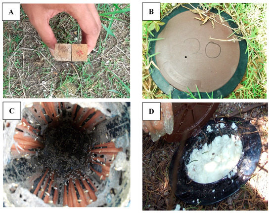 The experiment was carried out in Penang and Kedah, Malaysia. Five of the six sites were in Penang while one was in Kedah. Table 1 shows all of the locations involved in this study. Before the establishment of colony infestation status, oven-dried wooden stakes (2 cm diameter × 8 cm height), were installed surrounding the perimeter of the infested building (Figure 1A). The wooden stakes were buried at a depth of approximately 2.5 cm below the level of the ground. All wooden stakes that were attacked by the termites were replaced with Exterra monitoring stations (Ensystex, Malaysia Sdn. Bhd., Kuala Lumpur, Malaysia) (Figure 1B) and were labeled as active stations to record termite feeding activities (Figure 1C). Additional artificial underground monitoring stations were also placed next to the Exterra monitoring station to record termite feeding activities and were also labeled as active stations. Before the treatment, all active termite stations were inspected every two weeks to record the consumption data. At the end of the experiment, chlorfluazuron baits were placed in one of the active termite monitoring stations (Figure 1D).