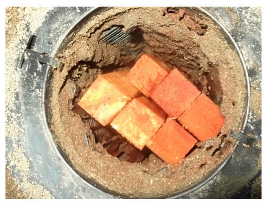 Two types of termite collection devices (stations) were used to position the bait matrixes during the treatment: in-ground stations (IGSs) and above-ground stations (AGSs). An IGS is usually a 1.3 L cylindrical plastic container (Ensytex Malaysia Sdn. Bhd., Kuala Lumpur, Malaysia) with perforated sides and a hole at the bottom to allow termite ingress and egress. A termite interceptor wooden piece (Eucalyptus delegatensis) was mounted in the six inner walls of the IGSs to allow easy detection of termites and placement of the bait matrix without causing significant disruption to termite foraging activity in the station. Six wooden stakes (18 × 1.5 × 1.5 cm) of Araucaria sp. were also placed at the center of the IGSs to make the station more favorable to termites. The IGSs were installed around the infested building perimeter at intervals of 2 m and the number of IGSs installed in each infested building varied depending on the space available. The IGSs were then covered with soil to avoid any outside disturbances. Figure 2 shows the set-up of the IGSs.