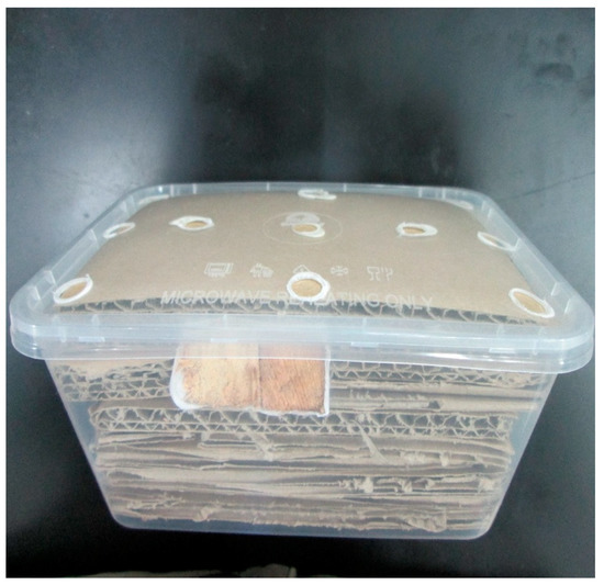 The AGSs comprised plastic boxes with perforations on the bottom to allow the movement of termites in or out. Inside the AGSs, corrugated cardboard and a wooden stake (9 × 1.5 × 1.5 cm) were arranged and placed to enhance termite foraging activity. The stations were installed using adhesive tape or nails in areas where termite activity was located. The numbers of AGSs installed in each of the infested buildings varied depending on the number of areas of termite activity present. The AGSs were then covered with black plastic sheets to avoid any outside disturbances. Figure 3 shows how the AGSs were set up.