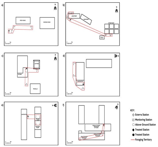 The IGSs/AGSs were inspected at intervals of two weeks. When termite activity was established, the stations were maintained to ensure that termite feeding activities continued. Maintenance was performed within the IGSs by cutting six wooden stakes (18 × 1.5 × 1.5 cm) and removing AGSs every two weeks. During the treatment, only one station was selected for bait placement at each of the sites. The selected station for baiting was chosen based on the active termite feeding consumption activities (wood consumption) within the termite foraging territories. If an IGS was chosen for bait placement, wooden stakes inside the IGSs were removed and replaced with doughy bait material (Requiem), a texture obtained by mixing the baits (100 g) with 400 mL of distilled water (1:4 wt:wt ratio). Similar to IGSs, corrugated cardboard and wooden stakes inside AGSs were removed and loaded with the same bait ratio (when AGS was chosen for bait placement) (Table 2). The bait was replenished at each inspection every two weeks until no termite feeding activity was detected at the bait stations. The treatment was considered successful when there were no longer termite feeding activities in all of the active IGSs and AGSs [24]. Figure 4a–f indicates the location of the selected station for the termite bait placement.