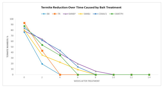 Another factor to be considered in the time difference needed to eliminate the colony is that the bait is toxicantly targeted toward species. Coptotermes and Schedorhinotermes are the most vulnerable species towards the tested bait [29]. In Malaysia, a Coptotermes colony requires a minimum of one month to suppress while the Schedorhinotermes species requires a minimum of six months [29]. By comparison, our results showed the termite colony baited at a single active termite station in Bandar Baharu and Taman Rupawan was eliminated in the first month, while the remaining sites took approximately 6.3–8.6 weeks to complete the elimination of termites. Higher termite genera such as Macrotermes, Globitermes, and Microtermes are less susceptible to the baits [29]. Chlorfluazuron is primarily successful in colony extinction of Coptotermes spp. while Macrotermes gilvus, Odontotermes formosanus, and Globitermes sulphureus consume more bait for a longer period to achieve colony elimination [30].