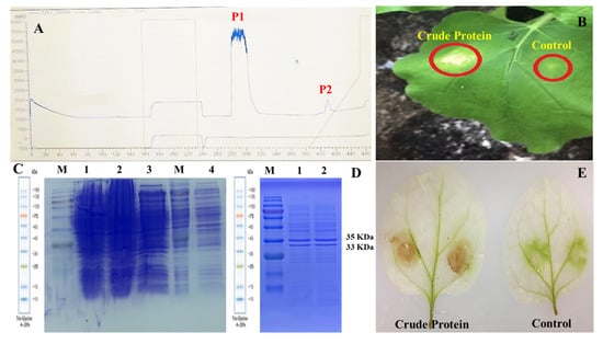 Ion-exchange chromatography of partially purified protein extracted from B. bassiana (ARSEF 2860) exhibited two peaks (Figure 1A). These two protein peaks were collected, desalted and infiltered into the leaves of tobacco (Nicotiana tabacum cv. Samsun-NN) to find out their bioactivity. Prominent necrotic zones appeared on the treated leaf areas 24 h post-infiltration (Figure 1B). Afterward, SDS-PAGE gel analysis produced two distinct protein bands of molecular weight of 33 and 35 kDa (Figure 1D). These protein bands were recovered and further bioassayed for their necrosis-inducing activity. Considerable reactive oxygen species (ROS) burst was observed in the leaves of N. tabacum treated with B. bassiana-derived crude protein, while no ROS burst was produced in the leaves treated with buffer (control) (Figure 1E).