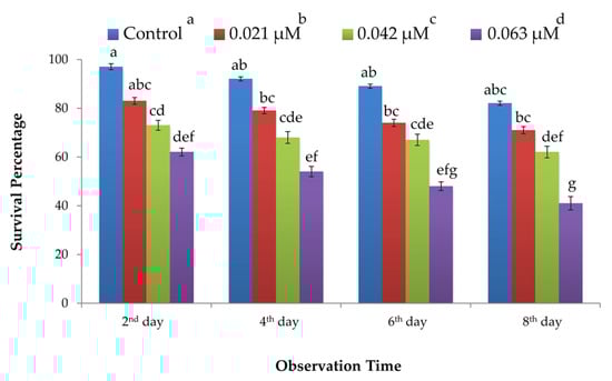 Survival percentage (± SEM; n = 10 for each treatment) of whitefly (B. tabaci) recorded for different concentrations of partially purified protein derived from B. bassiana (ARSEF 2860). Different letters indicate significant difference among treatments (univariate ANOVA; SNK test at α = 0.05). (cf. Table 1).