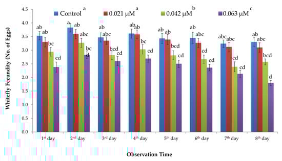 Similar trend was recorded for the impact of B. bassiana-derived protein on the fecundity rate of B. tabaci. Fecundity was significantly reduced on protein-treated plants as compared to control ones. A significant effect of protein concentrations was recorded on the fecundity of B. tabaci (F3, 288 = 7.52; p ≤ 0.001), whereas time alone and the interaction of concentration and time showed a non-significant impact (Table 2). Mean fecundity of B. tabaci was reduced along with the protein concentrations. The lowest fecundity rate (1.8 eggs day−1 female−1) was observed for the highest concentration (0.063 μM) of protein, while the maximum fecundity rate (3.1 eggs day−1 female−1) was recorded for the lowest concentration (0.021 μM) of protein. The mean fecundity rate observed for 0.042 μM concentration of protein was 2.3 eggs day−1 female−1. Buffer-treated (control) plants exhibited the maximum fecundity rate (3.3 eggs day−1 female−1) (cf. Figure 3).