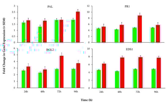 Expression levels of key genes potentially linked to the salicylic acid (SA)-associated plant defense pathways determined at different post-treatment time intervals (sample size n = 9 for each treatment). Green and red columns represent the results for buffer-treated (control) and protein-treated plants, respectively.