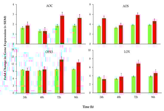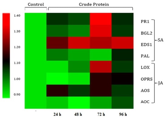 In order to find out the putative role of B. bassiana-derived protein in induced resistance in L. esculentum plants against B. tabaci, the expression of key genes related to JA- and SA-associated plant defense pathways were analyzed by RT-qPCR. Results revealed a significant (p = 0.05) up-regulation of all SA-associated pathway genes (PAL, PR1, BGL2 and EDS1; Table S1) observed at all post-insect exposure time intervals (Figure 4), whereas JA-associated pathway genes (AOC, AOS, OPR3 and LOX; Table S1) were moderately or slightly up-regulated (Figure 5). The maximum expressions of all the tested genes were recorded at 72 h post-insect exposure, as evidenced by a heat map of the gene expressions (Figure 6).