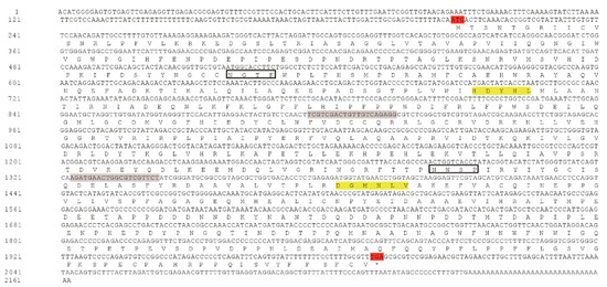 Nucleotide and deduced amino acid sequences of DcTPS from D. citri. Both initiation codon and termination codon are shaded in red. Motifs (or signature motifs) unique to trehalose-6-phosphate synthase (TPS) (residues 450–464 and 555–567) are shaded in yellow. Two glycosylation sites are indicated in black box. The primer sequences used for synthesis of dsRNA are shaded in gray.