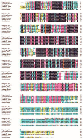 The amino acid alignment of trehalose-6-phosphate synthase (TPS) sequences from Diaphorina citri (MT675285), Acyrthosiphon pisum (XP_001944221), Diuraphis noxia (XP_015365486), Nilaparvata lugens (ACV20871), Sogatella furcifera (JQ013797), Cimex lectularius (XP_014255923). Signature motifs unique to trehalose-6-phosphate synthase (TPS) (HDYHL and DGMNLV) are indicated with red frame.
