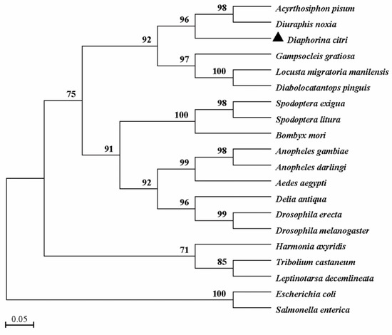 - Xiong, X.; Wu, L.Y.; Xin, T.R.; Wang, J.; Zou, Z.W.; Xia, B. The complete mitochondrial genome of Diaphorina citri (Hemiptera: Psyllidae) and phylogenetic analysis. Biochem. Syst. Ecol. 2017, 70, 230–238. [Google Scholar] [CrossRef]