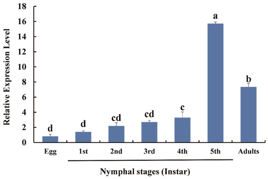 The relative expression levels of DcTPS at various stages were determined by RT-qPCR. The results suggested that DcTPS is continuously expressed at all developmental stages (F6,14 = 173.482, p = 0.0001). The expression of DcTPS increased steadily from the egg stage and reached a maximum in fifth-instar nymphs (Figure 4). The expression of DcTPS in adults declined slightly (Figure 4). As shown by the data, the expression level of DcTPS in the fifth-instar nymphs was 19.13 times higher than in the eggs. At the same time, the expression level in adult D. citri was 8.93 times higher than in the eggs. The different temporal expression patterns evident from the data suggest distinct physiological roles of DcTPS.
