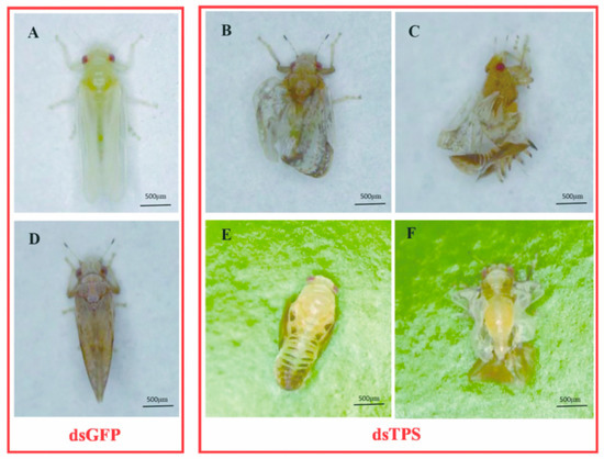 Furthermore, compared to the dsGFP group (Figure 5A,D), three distinct phenotypic characteristics were evident in D. citri after silencing of the DcTPS gene. Firstly, fifth-instar nymphs were not able to complete a normal molt before death (Figure 5E). Secondly, some of the emerged adults fed with dsDcTPS showed “misshapen wings” (Figure 5B,F). Thirdly, partially deformed adults could not get rid of the cuticle from the nymphal stage (Figure 5C). Individuals from the dsGFP control group did not exhibit prominent variation in phenotype.