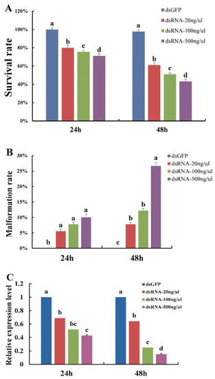 Furthermore, after continuous feeding on the dsDcTPS-containing diet, the average malformation rate increased to 7, 12 and 26% on treatments after 48 h (F3,8 = 36.970, p = 0.0001) separately. This was significantly higher than malformation rates in the dsGFP group (Figure 6B).
