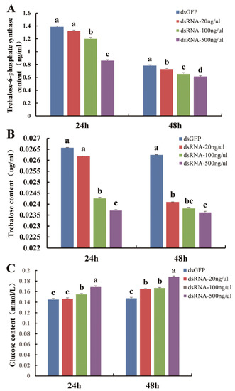 Detection of trehalose-6-phosphate synthase content (A), trehalose content (B) and glucose content (C) in D. citri after feeding dsRNA for 24 and 48 h. Bars with different letters are significantly different according to SNK test (p < 0.05).