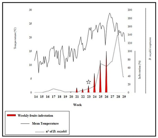 Summary graph of temperature, weekly fruit infestation (% of infested fruits) and D. suzukii captures during field survey (flies/trap). The star indicates the week of the L. japonica find.