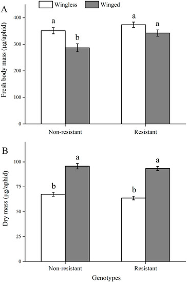 - Yang, X.W.; Liu, X.X.; Xu, X.L.; Li, Z.; Li, Y.S.; Song, D.Y.; Yu, T.; Zhu, F.; Zhang, Q.W.; Zhou, X.G. Gene expression profiling in winged and wingless cotton aphids, Aphis gossypii (Hemiptera: Aphididae). Int. J. Biol. Sci. 2014, 10, 257–267. [Google Scholar] [CrossRef]