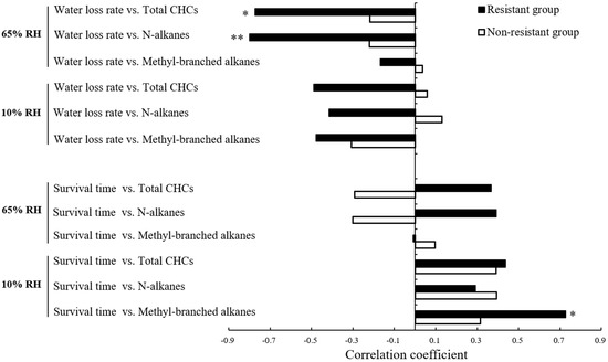 - Ferveur, J.F.; Jerme, C.; Rihani, K.; Cobb, M.; Everaerts, C. Desiccation resistance: Effect of cuticular hydrocarbons and water content in Drosophila melanogaster adults. PeerJ 2018, 6, e4318. [Google Scholar] [CrossRef] [PubMed]