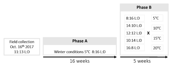 The day after field collections, 1440 individuals were randomly spread in 33 plastic aerated boxes (12 × 12 × 6.5 cm), and transferred to a climatic walk-in chamber at 5.0 °C ± 1.0, with a photoperiod of 8:16 (L:D), mimicking a cold constraint close to natural winter conditions in the area. All boxes were checked regularly during winter to ensure the absence of mold. Individuals were left exposed to these conditions for 16 weeks, as [23] showed that developmental success consecutive to winter diapause is maximal in this species after a minimal cold exposure of 3.5 to 4 months. This phase of the experiment is hereafter referred to as phase A (Figure 1).