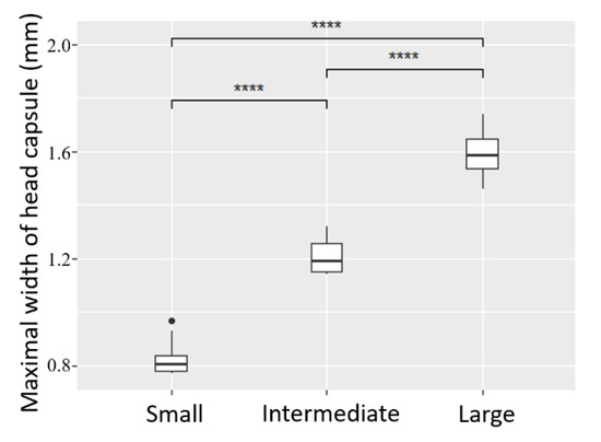 Head capsule width of a sub-sample of larvae according to abdomen length classes visually defined from X-ray pictures: Large (n = 7), Intermediate (n = 8), Small (n = 10). ANOVA and Tukey post-hoc test, ****: p-value < 0.0001.