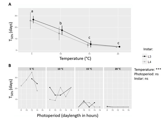 Exposure time to experimental termination conditions until 50% of larvae resumed their activity (T50%). (A) T50% depending on Temperature and Instar. All photoperiod conditions are grouped. Letters indicates significant differences after a Tukey post-hoc test with a threshold of α = 0.05. Curves are shifted along the x axis to ease visualization. Error bars: standard deviation. (B) T50% depending on Temperature, Instar and Photoperiod (only in groups where diapause rate decreased below 50% during phase B). Results of a three-way ANOVA testing the effects of Temperature, Instar and Photoperiod on T50% are indicated, ns: not significant, ***: p-value < 0.001.