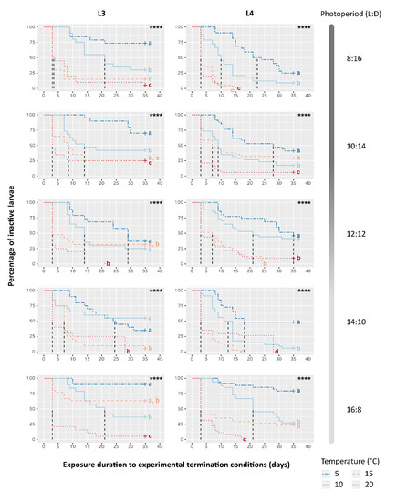 Kaplan-Meier representation of the evolution over time of the percentage of inactive larvae depending on Temperature, Photoperiod and larval instar (L3 or L4). Dashed vertical lines correspond to the exposure time until 50% of larvae resumed their activity (T50%). Moreover, “+” indicates data censure, i.e., the presence of larvae still inactive at the end of experiment. Log-rank test results are reported in each graph, ****: p-value < 0.0001. Different letters show significant differences (α = 0.05) among curves of the same graph after pairwise comparisons and a Benjamini-Hochberg correction.