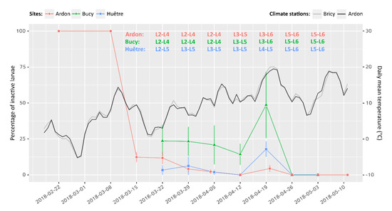 Evolution of the percentage of inactive larvae over time (left axis) and daily mean temperature (right axis) in three different locations. The Bricy climate station is located close to the Bucy–Saint–Liphard (site B) and Huêtre (site C) sites where larvae were monitored (5.2 and 4.3 km, respectively). Error bars: standard deviation. For each sampling, active larval instars were identified using head capsule width measurements on a sub-sample of 30 individuals per site. Sources of climate data: Météo France (Bricy) and INRAE (Ardon).