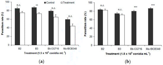 Percentage of Duponchelia fovealis eggs parasitized by Trichogramma atopovirilia in free-choice tests, comparing eggs sprayed with Beauveria bassiana strains (B2 and B3) and commercial bioinsecticides (Bb CG716 and Ma IBCB348) vs. control solutions: (a) 1.5 × 105 conidia mL−1; (b) 1.5 × 108 conidia mL−1. Error bars indicate standard errors (n = 15). Significant differences between a given treatment (entomopathogen) and its corresponding control (water), according to the Wilcoxon test, are shown over the bars as follows: n.s. = not significant; ** = p-value < 0.01; *** = p-value < 0.001.