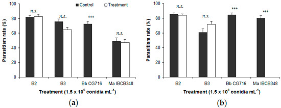 Percentage of Duponchelia fovealis eggs parasitized by Trichogramma pretiosum in free-choice tests, comparing eggs sprayed with Beauveria bassiana strains (B2 and B3) and commercial bioinsecticides (Bb CG716 and Ma IBCB348) vs. control solutions: (a) 1.5 × 105 conidia mL−1; (b) 1.5 × 108 conidia mL−1. Error bars indicate standard errors (n = 15). Significant differences between a given treatment (entomopathogen) and its corresponding control (water), according to the Wilcoxon test, are shown over the bars as follows: n.s. = not significant; *** = p-value < 0.001.
