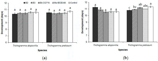 Average length of the egg-to-adult period of development of Trichogramma atopovirilia and Trichogramma pretiosum individuals emerged from Duponchelia fovealis eggs sprayed with Beauveria bassiana strains (B2 and B3) and commercial bioinsecticides (Bb CG716 and Ma IBCB348) pre- (a) and post-parasitism (b). Error bars are standard errors (n = 15). Small letters over the bars indicate significant differences among treatments according to the Tukey HSD test (p-value < 0.05).