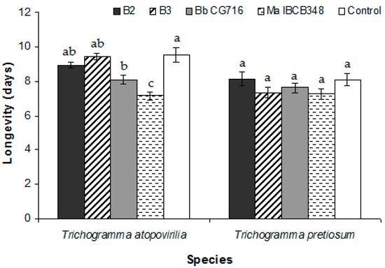 Average longevity of Trichogramma atopovirilia and Trichogramma pretiosum individuals emerged from Duponchelia fovealis eggs sprayed with Beauveria bassiana strains (B2 and B3) and commercial bioinsecticides (Bb CG716 and Ma IBCB348) pre-parasitism. Error bars are standard errors (n = 15). Small letters over the bars indicate significant differences among treatments according to the Tukey HSD test (p-value < 0.05).