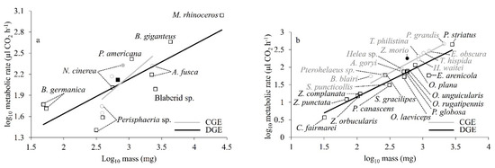 The relationships of log10 metabolic rate and log10 mass of (a) cockroach species, and (b) tenebrionid beetle species using either CGE or DGE. Data were corrected to a common measurement temperature of 23 °C, assuming a Q10 value of value of 2.0. Filled symbols are for data points from our study and open symbols are for data points from the literature (circles, CGE; squares, DGE; see Supplementary Tables S3 and S4 for further information).