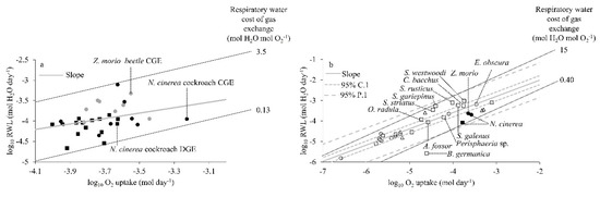 When compared, the linear regression relationships of log10RWL (mol H2O day−1) and log (mol O2 day−1) of the individual speckled cockroaches using CGE or DGE and beetles using CGE resulted in a common slope (0.263, p = 0.950), which indicates a constant respiratory water cost of gas exchange of about 0.76 mol H2O mol O2−1 (Figure 4a). There was considerable variation between individuals (0.13–3.5 mol H2O mol O2−1). The intercept was not significantly different between cockroach individuals using CGE or DGE (p = 0.374) and between cockroach and beetle individuals using CGE (p = 0.284). In other words, the respiratory water cost of gas exchange was similar within the same species for its individuals using different gas exchange patterns and between both species showing the same gas exchange pattern (Figure 4a).
