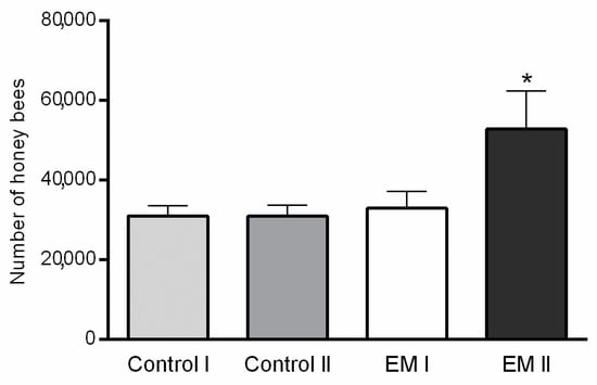 Honey bee colony strength differences between experimental (EM I, EM II) and control (Control I, Control II) groups by estimation dates (I-1st day, II-40th day of the experiment); statistically significant difference: Control II vs. EM II; * p < 0.05; mean ± SD.