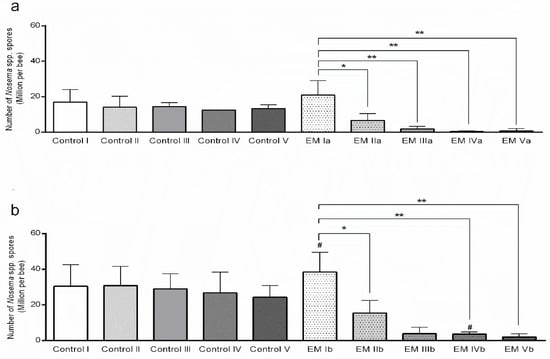 Number of Nosema spp. spores per honey bee during additional feeding in field conditions; (a) food application by spraying, (b) food application in feeders. * p < 0.01, ** p < 0.001 (statistically significant difference between sampling days for experimental group EM); # p < 0.01 (Control I vs. EM Ib, Control IV vs. EM IVb), mean ± SD.