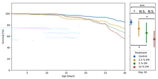 The adult bees’ mortality curves during trials in laboratory-controlled conditions, for control and experimental groups (EM 2.5%, EM 5%, EM 10%); asterisks indicate statistically significant differences: Control vs. EM II vs. 2.5% EM, * p < 0.01; Control vs. 10% EM, *** p < 0.001; N.S.: No significant differences.