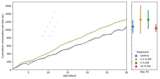 The honey bees revealed no significant difference in cumulative diet consumption during trials in laboratory-controlled conditions, between the three experimental groups (EM 2.5%, EM 5%, EM 10%), as well as between the mentioned experimental groups and control group (Figure 4). The mean cumulative consumption per control group was 1077.58 µL and for experimental groups (EM 2.5%, EM 5%, EM 10%) were 1256.12, 1254.50, and 1040.54 µL, respectively.